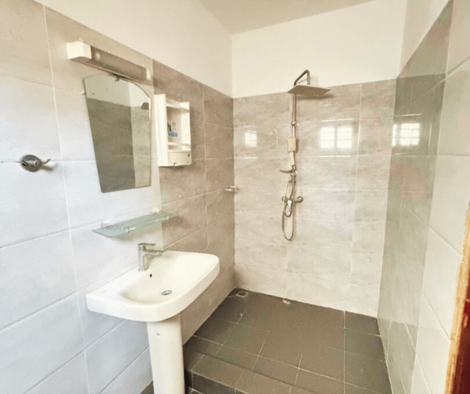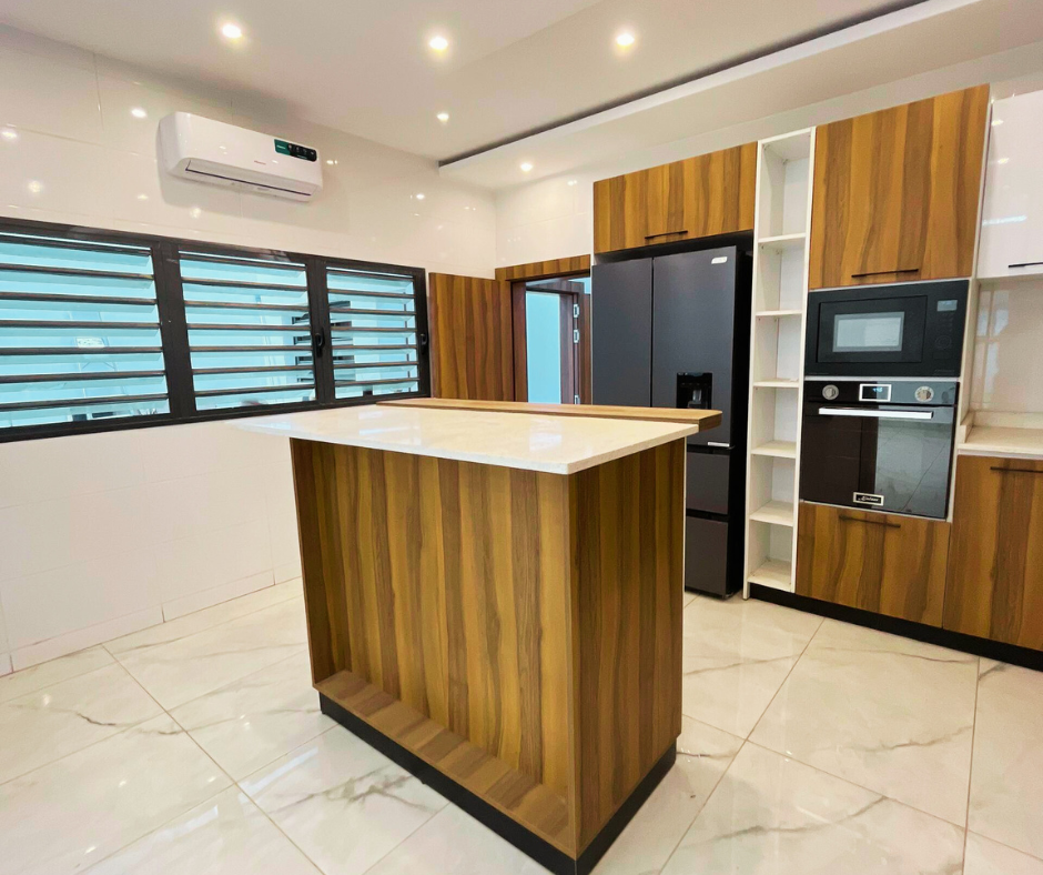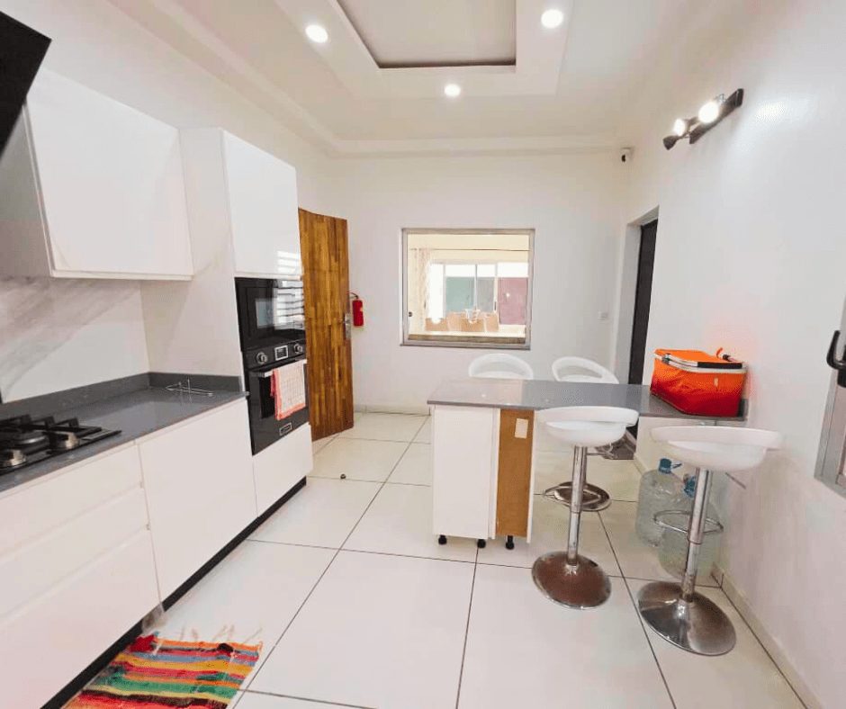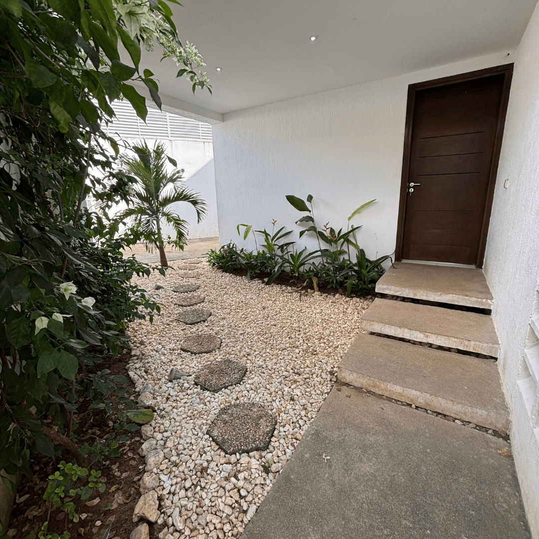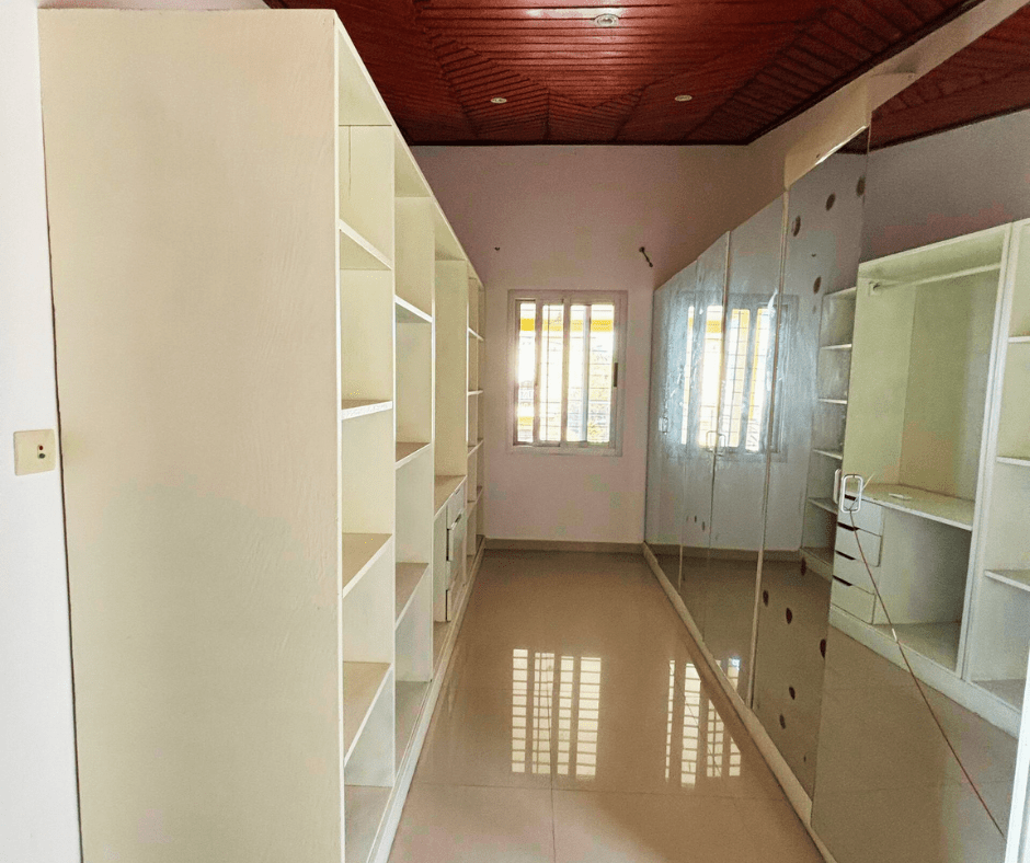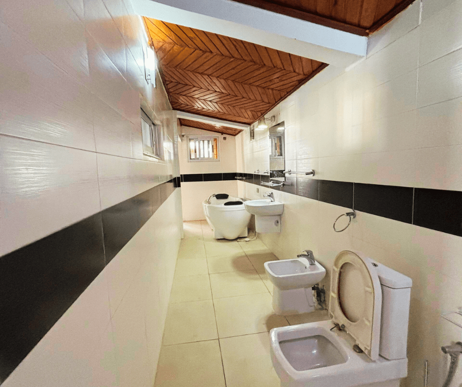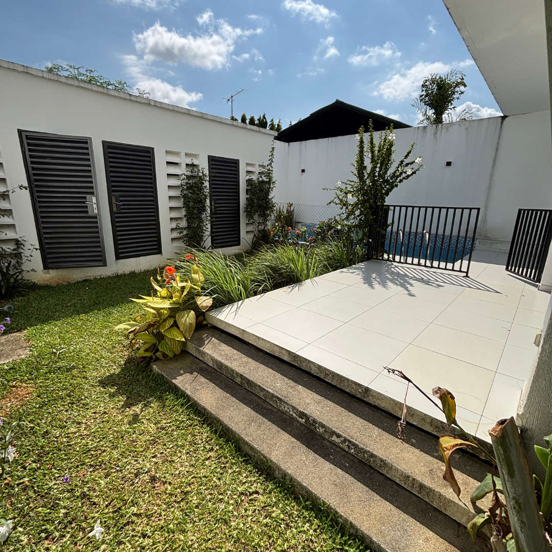 Elle comprend un grand salon, deux cuisines, une terrasse, une chambre de service, un garage pour deux véhicules, une cour avant et arrière, ainsi que quatre chambres autonomes à l’étage.